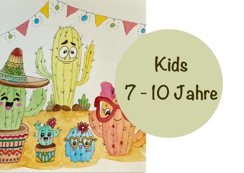 Wir malen diesen Monat eine Kaktusparty im Kawaii-Stil! Unsere Kakteen bekommen lachende und süße Gesichter. Wir malen mit professionellen Aquarellfarben auf 300 g Baumwollpapier speziell für Aquarellmalerei. Das ganze Material steht zur Verfügung, du musst also nichts mitbringen und kannst gleich loslegen. Du erhältst von mir eine vorbereitete Vorlage, du kannst aber auch gerne deine ganz eigenen Kakteen malen. Deiner Fantasie sind keine Grenzen gesetzt. Je bunter und süßer, desto cooler ist die Party auf dem Papier!